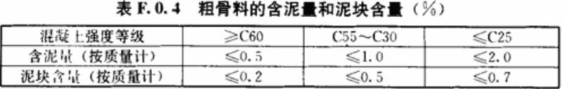 F.0.4 粗骨料的含泥量和泥块含量应符合表F.0.4的规定。