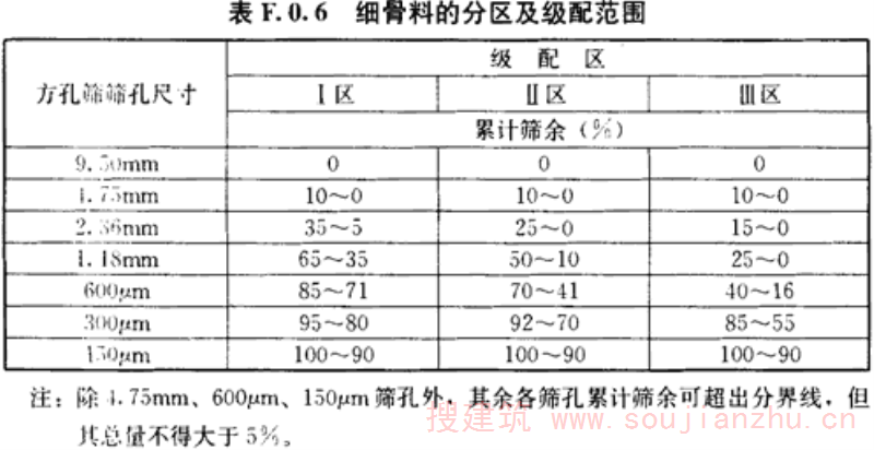 F.0.6 细骨料的分区及级配范围应符合表F.0.6的规定。