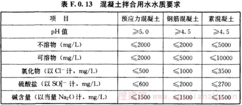 F.0.13 混凝土拌合用水水质应符合表F.0.13的规定。