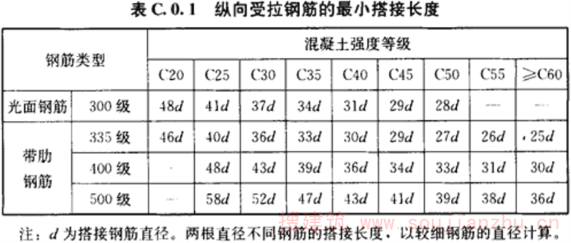 C.0.1 当纵向受拉钢筋的绑扎搭接接头面积百分率不大于25%时,其最小搭接长度应符合表C.0.1的规定。