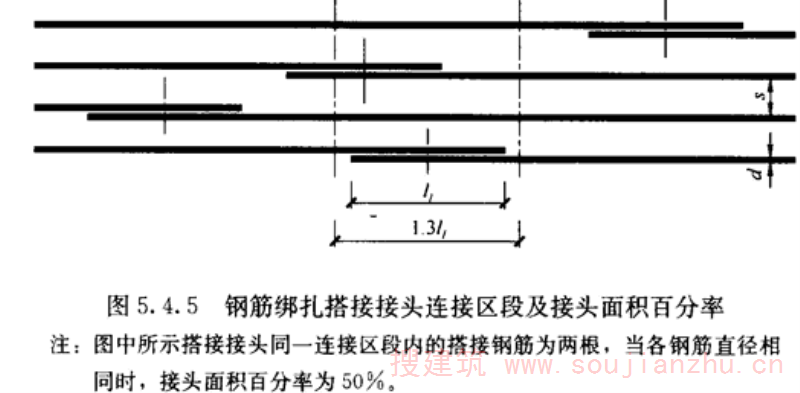 C.0.1、C.0.2 根据国家标准《混凝土结构设计规范》GB 50010-2010的规定,绑扎搭接受力钢筋的最小搭接长度应根据钢筋及混凝土的强度经计算确定,并根据搭接钢筋接头面积百分率等进行修正。当接头面积百分率为25%~100%的中间值时,修正系数按25%~50%、50%~100%两段分别内插取值。