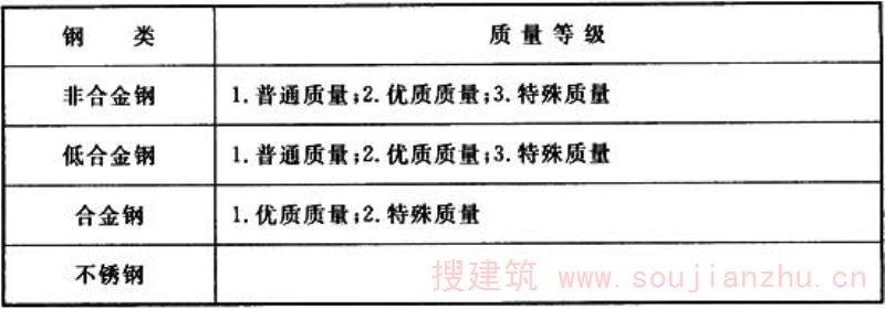 4.1.1 根据现行国家标准《钢分类》GB/T 13304和2004年1月1日实施的《中国钢铁工业生产统计指标体系》,钢按化学成分和质量等级分为“四类八级”,钢种分类应符合表2的规定。 表2 《中国钢铁工业生产统计指标体系》钢种分类表