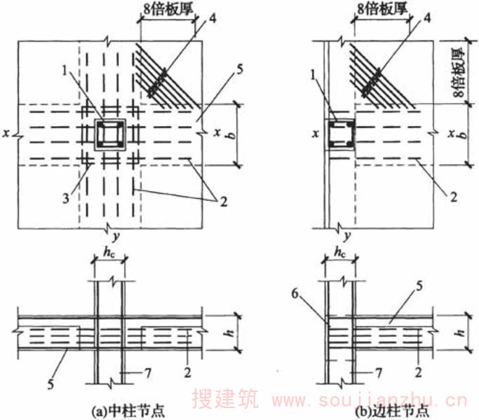 1-柱内核心区箍筋;2-核心区附加腰筋;3-核心区附加水平箍筋;4-板面附加斜向钢筋;5-扁梁;6-框架边梁;7-柱