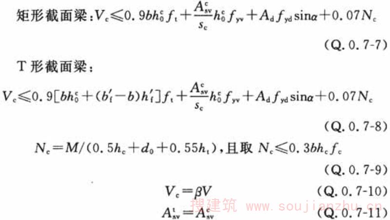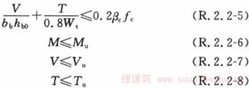 2 垂直于风荷载作用方向的扁梁端,处于弯矩、剪力、扭矩共同作用下,其截面限制条件及承载力,应符合下列表达式的要求,其截面配筋可按弯矩、剪力和扭矩分别计算的纵向受拉钢筋和箍筋面积叠加后确定: