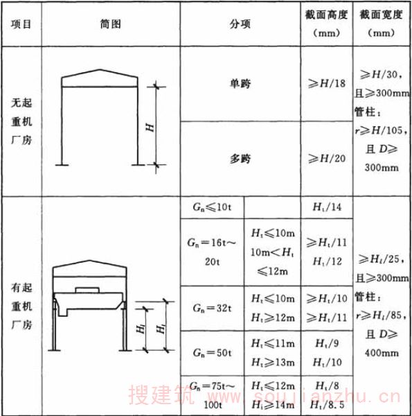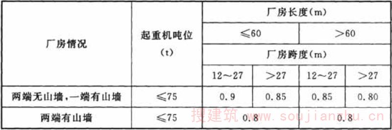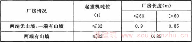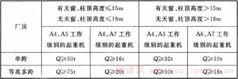 1.0.2 机械工业厂房类型的划分一般可按以下原则:无桥式起重机或起重量不大于20t的A1~A5工作级别桥式起重机的厂房为轻型厂房,起重量大于100t的桥式起重机的厂房为重型厂房,其余为中型厂房。