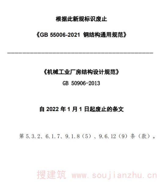 现批准《机械工业厂房结构设计规范》为国家标准,编号为GB 50906-2013, 自2014年3月1日起实施。其中,第5.3.2、6.1.2、6.1.3、6.1.5、6.1.6、6.1.7、6.1.8、9.1.8(5)、9.6.12(9)条(款)为强制性条文,必须严格执行。