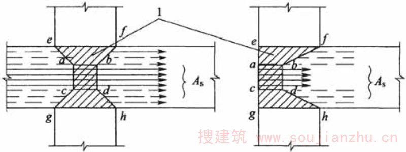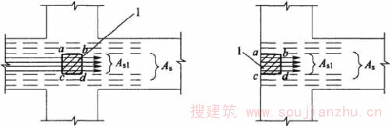 A s -全部纵向受拉钢筋;A s1 -通过核心区1的纵向受拉钢筋;1-破坏范围