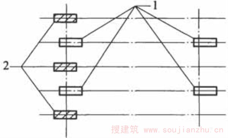 R.3.4 当中柱节点和边柱节点在扁梁交角处的板面顶层纵向钢筋和横向钢筋间距大于200mm时,应在板面布置附加的斜向钢筋(图R.3.4)。