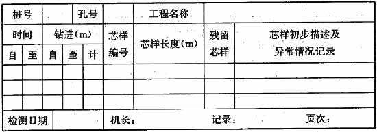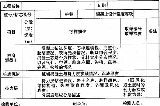 D.0.1 钻芯法检测的现场操作记录和芯样编录应分别按表D.0.1-1和表D.0.1-2的格式记录;检测芯样综合柱状图应按表D.0.1-3的格式记录和描述。