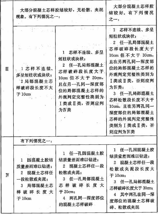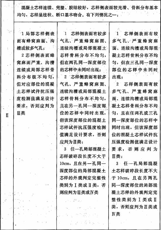 2.1.2 桩身完整性是一个综合定性指标,而非严格的定量指标,其类别是按缺陷对桩身结构承载力的影响程度划分的。这里有三点需要说明: 1 连续性包涵了桩长不够的情况。因动测法只能估算桩长,桩长明显偏短时,给出断桩的结论是正常的。而钻芯法则不同,可准确测定桩长。 2 作为完整性定性指标之一的桩身截面尺寸,由于定义为“相对变化”,所以先要确定一个相对衡量尺度。但检测时,桩径是否减小可能会比照以下条件之一: