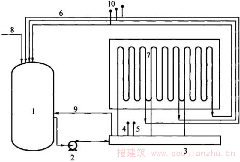 1-水箱;2-水泵;3-稳压装置;4-温度计;5-压力表;6-回水管;7-冷却水管;8-进水管;9-溢流管;10-温度计