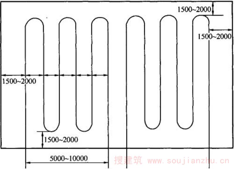 C.0.1 水冷却管水平布置时,水管距混凝土边缘距离宜为1500mm~2000mm,管间距按本规范第6.3.2条选用;单层多回路水冷却管宜布置在浇筑混凝土的同一水平面,各回路之间应并联与主管道相连,每回路宽度宜为5000mm~10000mm(图C.0.1)。