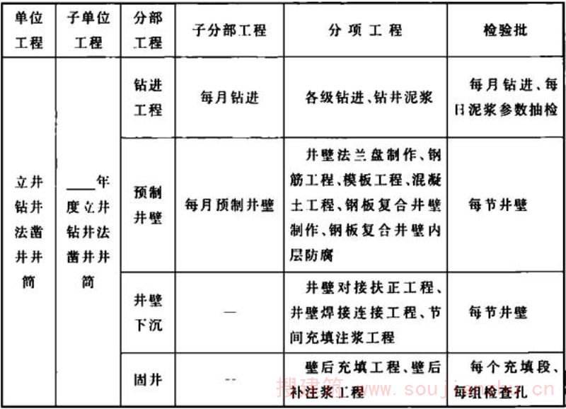 1.0.3钻井法凿井是一种专业性很强的特殊凿井方法,由专业化单位组织施工,具备独立施工条件,能形成独立使用的功能单元,故划分为单位工程,但由于钻凿井筒施工时间一般较长,可按施工年度划分为子单位工程,工程按附录A的划分组织验收。
