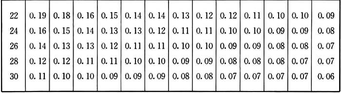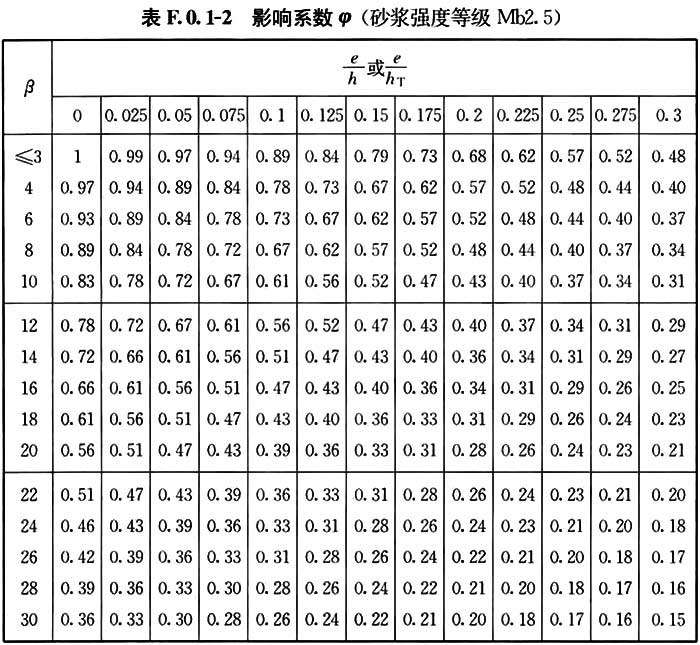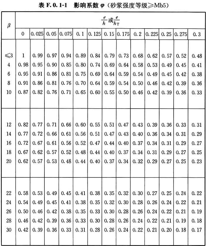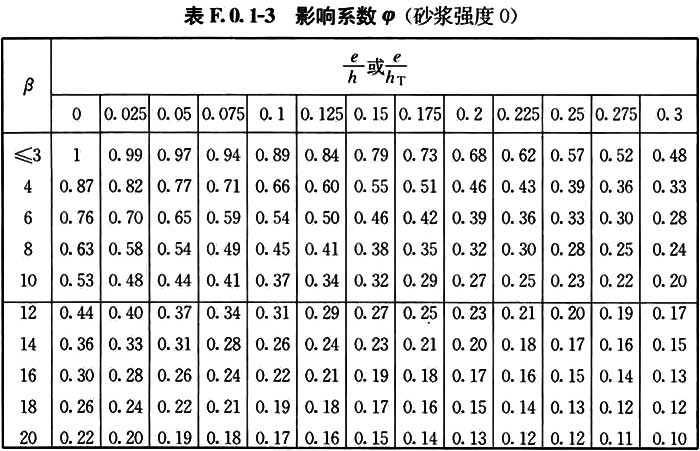 F.0.1 高厚比β和轴向力偏心距e对受压构件承载力的影响系数φ,应按表F.0.1-1~表F.0.1-3采用: