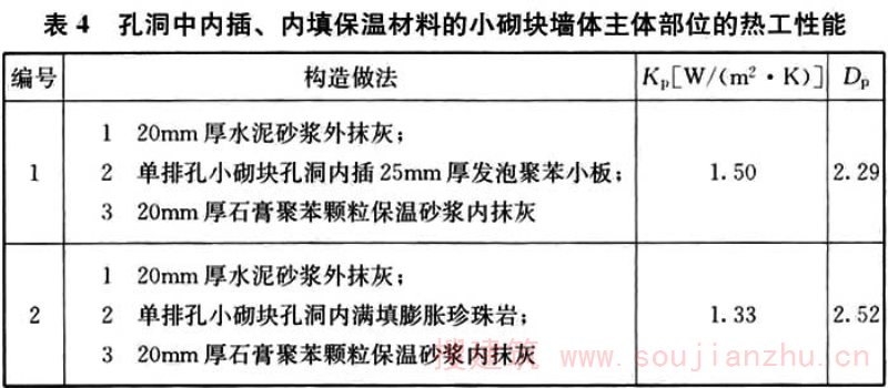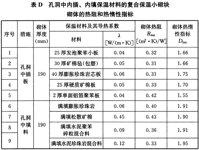 附录D孔洞中内插、内填保温材料的复合保温小砌块砌体的热阻和热惰性指标