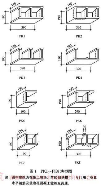 由普通混凝土制成,主要规格尺寸为390mm×190mm×190mm、孔洞率在46%~48%、壁和肋部开有槽口、适合配筋小砌块砌体施工的单排孔空心砌块。