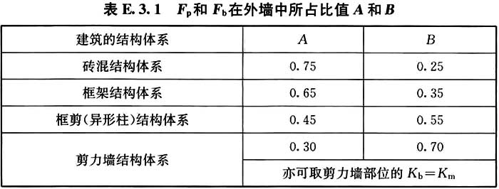 A、B——分别为外墙主体部位和结构性热桥部位的面积F p 、F b 在建筑外墙中(不含外门、外窗)所占的面积比值,可计算统计得出,亦可根据设计建筑的结构体系按表E.3.1选取。