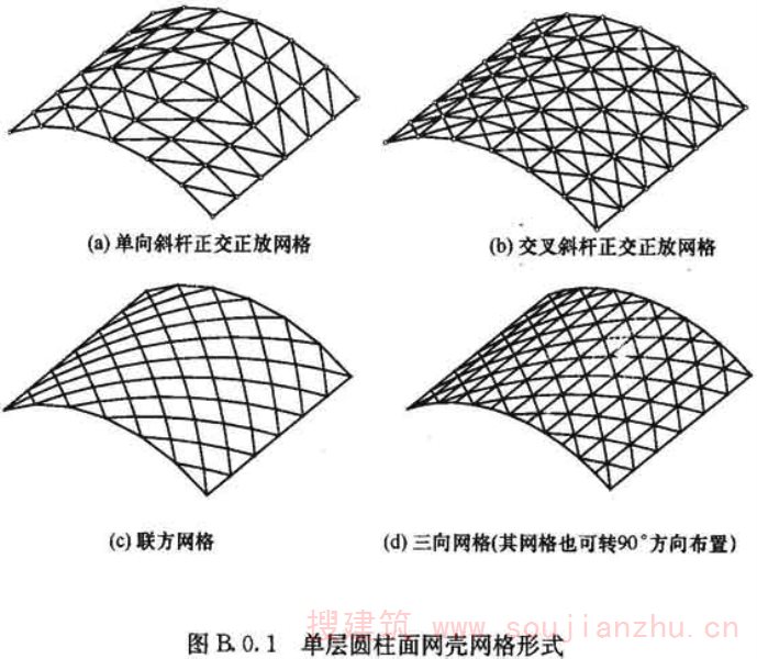 B.0.1 单层圆柱面网壳网格可采用下列四种形式: