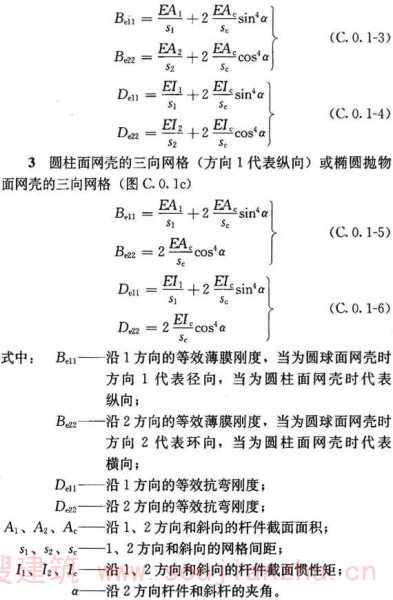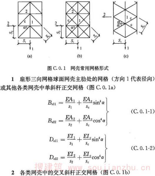C.0.1 网壳的各种常用网格形式可分为图C.0.1所示三种类型,其等效薄膜刚度B e 和等效抗弯刚度D e 可按不同类型所给出的下列公式进行计算。