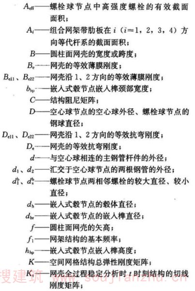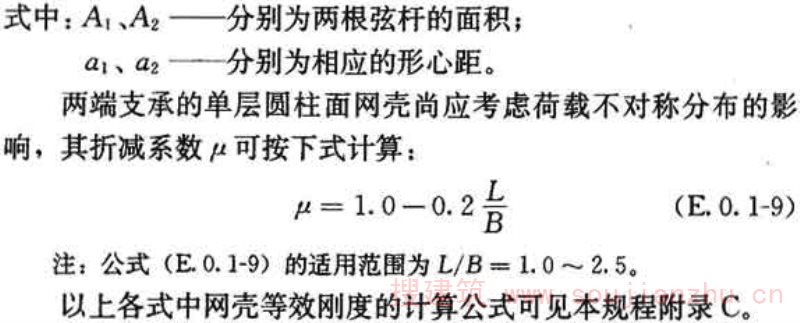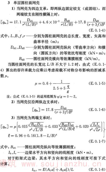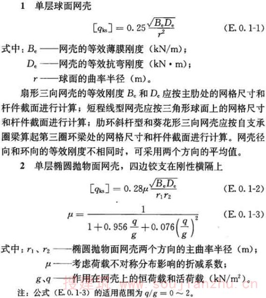 E.0.1 当单层球面网壳跨度小于50m、单层圆柱面网壳宽度小于25m、单层椭圆抛物面网壳跨度小于30m,或对网壳稳定性进行初步计算时,其容许承载力标准值[q ks ](kN/m 2 )可按下列公式计算: