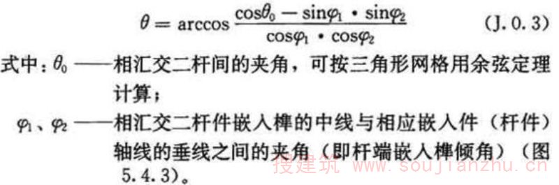 J.0.3 嵌入式毂节点中的毂体上各嵌入槽轴线间夹角θ应为汇交于该节点各杆件轴线间的夹角在通过该节点中心切平面上的投影(图5.4.6a),应按下式计算: