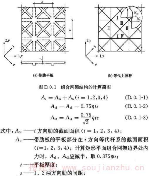 D.0.1 当组合网架结构的带肋平板采用如图D.0.1a的布置形式时,可假定为四组杆系组成的等代上弦杆(图D.0.1b),其截面面积应按下列公式计算: