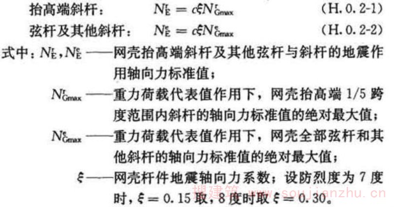 H.0.2 对于轻屋盖单层双曲抛物面网壳结构,斜杆为拉杆(沿斜杆方向角点为抬高端)、弦杆为正交正放网格;当四角固定铰支承、四边竖向铰支承,按7度或8度设防、Ⅲ类场地、设计地震分组第一组进行多遇地震效应计算时,其杆件地震作用轴向力标准值可按下列方法计算: