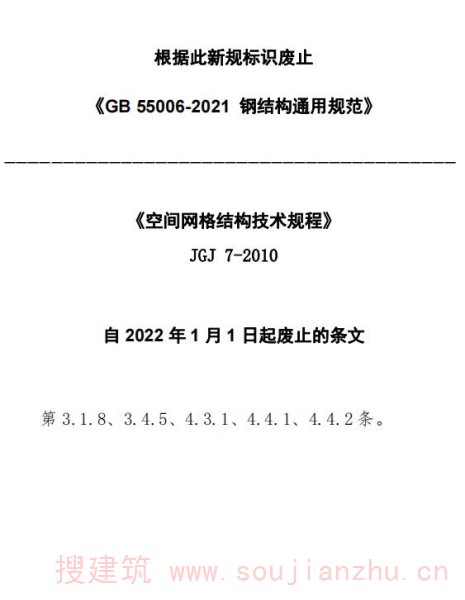 现批准《空间网格结构技术规程》为行业标准,编号为JGJ 7-2010,自2011年3月1日起实施。其中,第3.1.8、3.4.5、4.3.1、4.4.1、4.4.2条为强制性条文,必须严格执行。原行业标准《网架结构设计与施工规程》JGJ 7-91和《网壳结构技术规程》JGJ 61-2003同时废止。