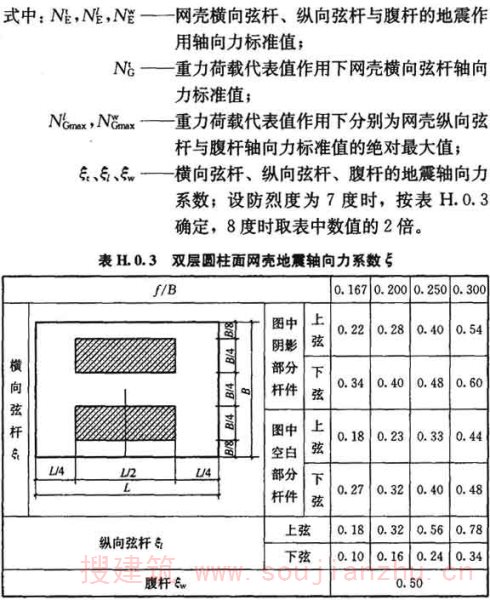 H.0.3 对于轻屋盖正放四角锥双层圆柱面网壳结构,沿两纵边固定铰支承在上弦节点、两端竖向铰支在刚性横隔上,当按7度及8度设防、Ⅲ类场地、设计地震分组第一组进行多遇地震效应计算时,其杆件地震作用轴向力标准值可按下列方法计算: