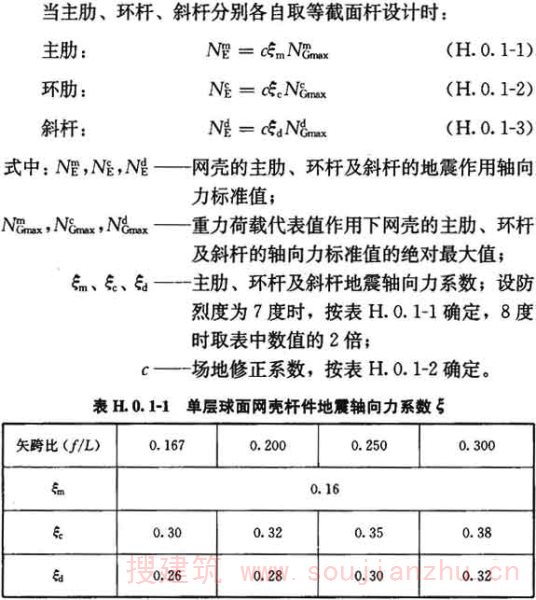 H.0.1 对于轻屋盖的单层球面网壳结构,采用扇形三向网格、肋环斜杆型或短程线型网格,当周边固定铰支承,按7度或8度设防、Ⅲ类场地、设计地震分组第一组进行多遇地震效应计算时,其杆件地震作用轴向力标准值可按下列方法计算: