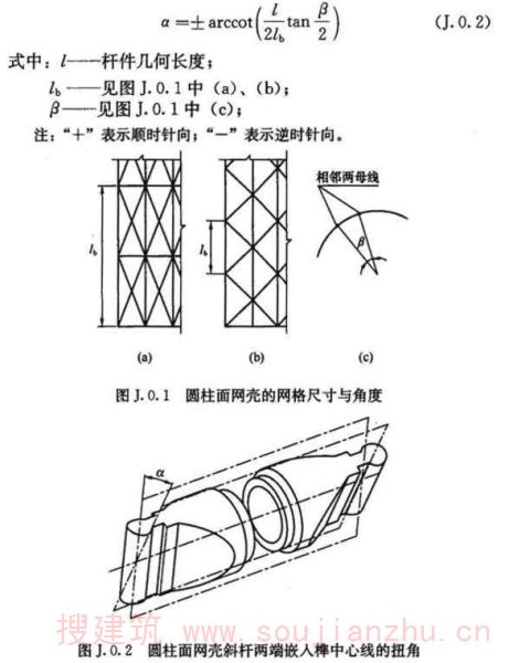 J.0.2 球面网壳杆件和圆柱面网壳的环向杆件,同一根杆件的两端嵌入榫中心线在同一平面内;圆柱面网壳的斜杆两端嵌入榫的中心线不在同一平面内(图J.0.2),其扭角α应按下式计算: