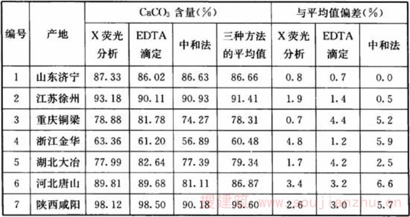 表2不同测试方法的石灰石粉中CaCO3含量与平均值的偏差