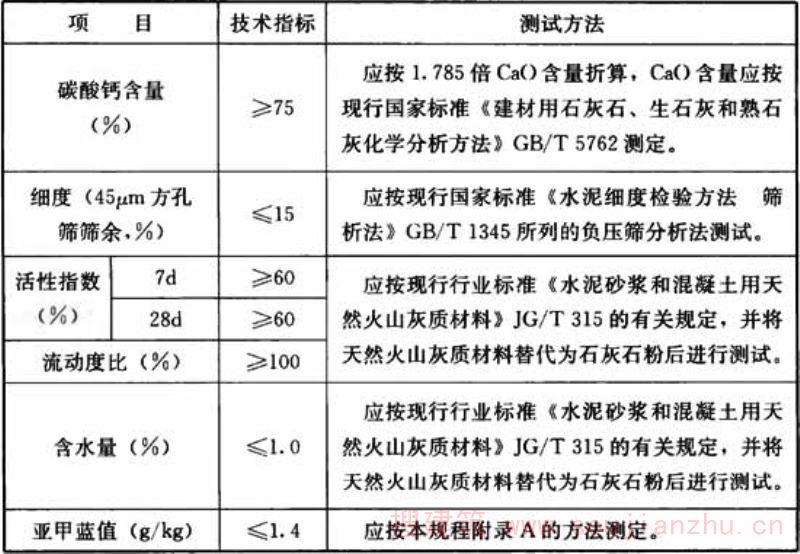 3.1.1 石灰石粉的碳酸钙含量、细度、活性指数、流动度比、含水量、亚甲蓝值及测试方法应符合表3.1.1的规定。