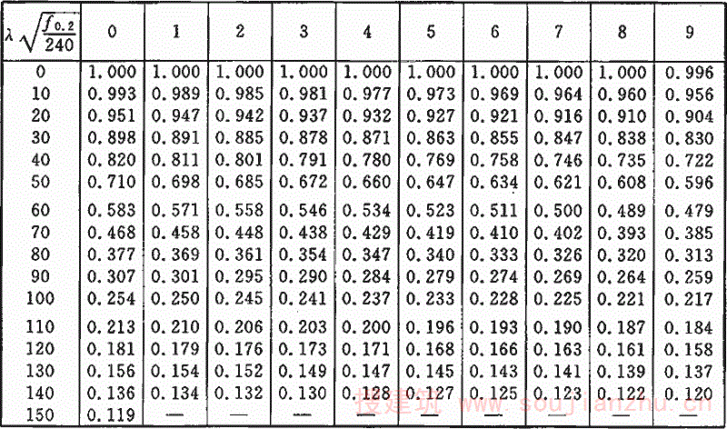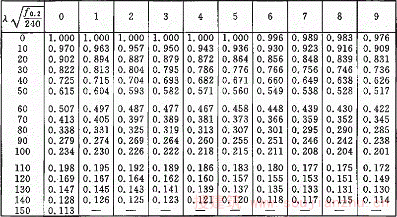 表B-2 强硬化合金构件的轴心受压稳定系数 φ