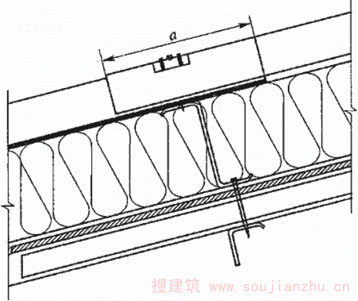 11.5.2 铝合金面板长度方向的搭接端必须与檩条、支座、墙梁等支承构件有可靠的连接(图11.5.2),搭接部位应设置防水堵头,搭接处可采用焊接或泛水板,搭接部分长度方向中心宜与支承构件形心对齐,搭接长度 a 不宜小于下列限值: