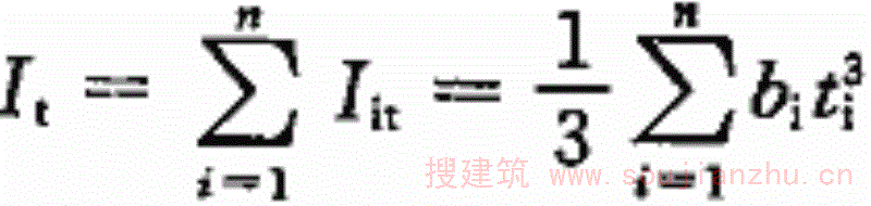 I t ——毛截面扭转惯性矩,若截面是由长度为 h i ,和厚度为 t i 的 n 个矩形块组成则可取 I t 为: