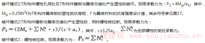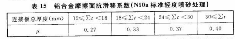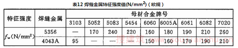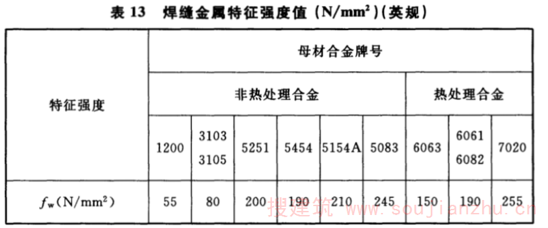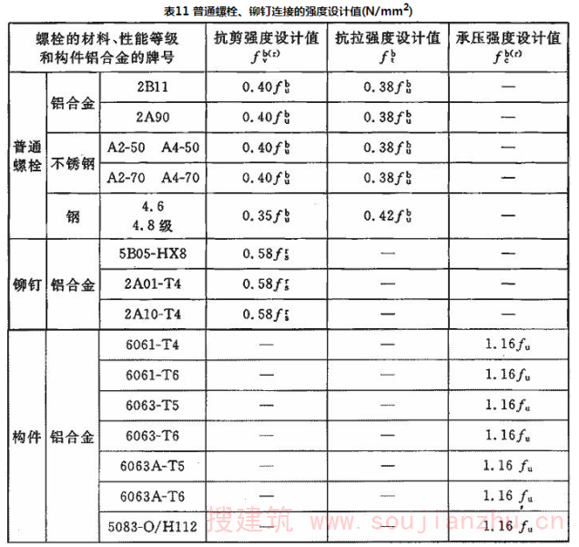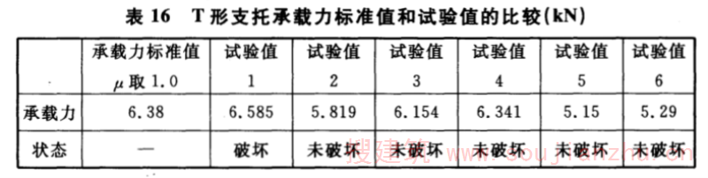 11.3.3、11.3.4 铝合金面板T形支托的稳定性可按等截面模型进行简化计算。支托端部受到板面的侧向支撑,根据面板侧向支撑情况,支托的计算艮度系数 μ 的理论值范嗣为0.7~2.0。同济大学进行的0.9mm厚、65mm高、400mm宽的铝合金面板(图11.1.1a)实验中,量测了T形支托破坏时的支座反力值,表16为按本规范公式(11.3.3)计算得到的承载力标准值(取 μ 为1.0、f为f0.2)和试验值。考虑到实验得到的支托破坏数据有限,而板厚板型对支托侧向支撑的影响又比较复杂,本规范建议根据实验确定计算长度值。