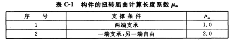l ω ——扭转屈曲计算长度,取决于构件端部的约束条件, l ω = μ ω l , μ ω 为扭转屈曲计算长度系数,应按表C-1取用;