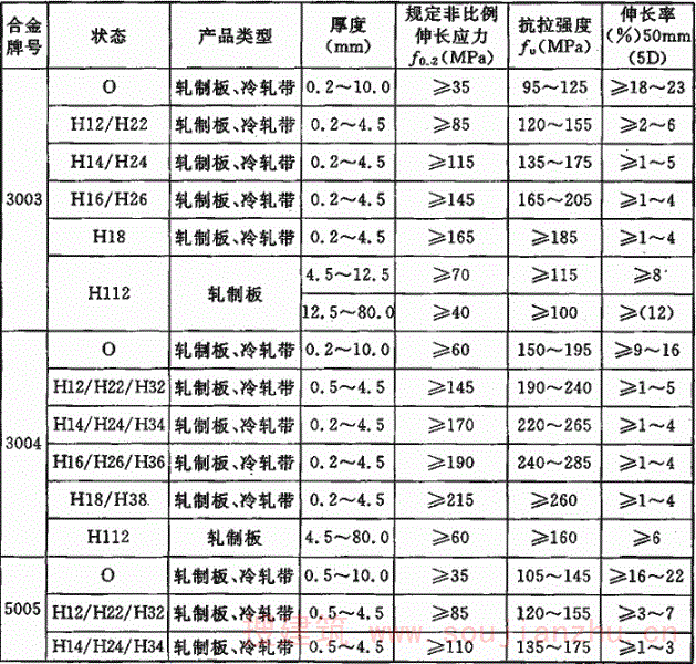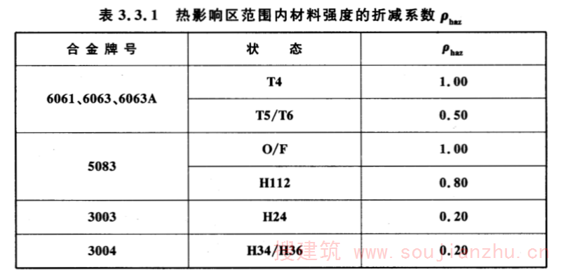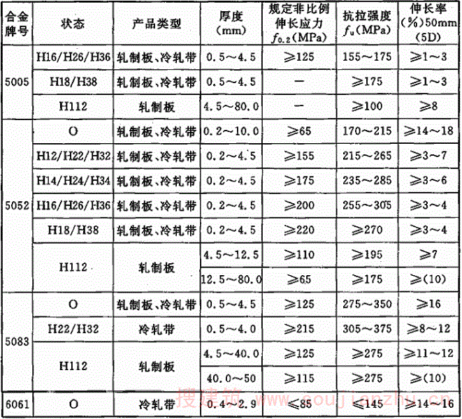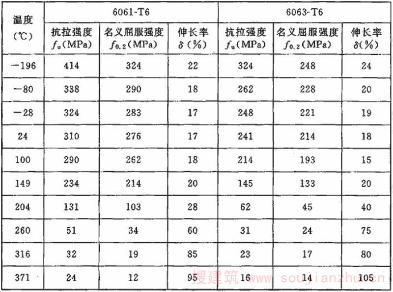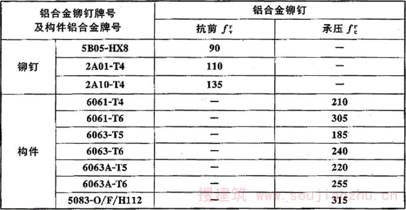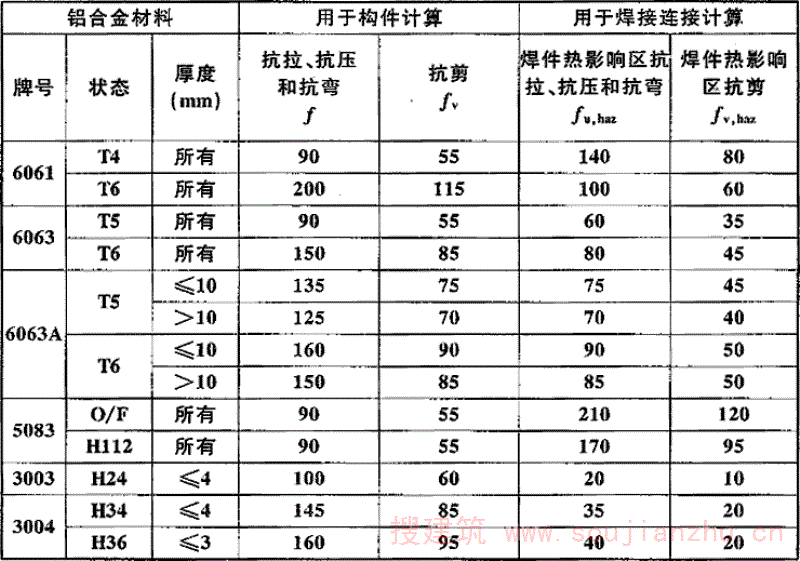 常见结构用铝合金板、带材力学性能(标准值)可按表A-1采用,结构用铝合金管材、型材力学性能(标准值)可按表A-2采用。结构用铝合金板、带材、管材、型材的化学成分可按表A-3采用。凡采用的材料在表中未给出规定非比例伸长应力 f 0.2 值或抗拉强度 f u 值的,应通过试验确定其标准值。