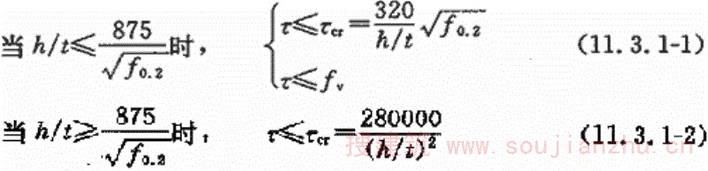 11.3.1 式(11.3.1-1)和(11.3.1-2)分别为腹板弹塑性和弹性剪切屈曲临界应力设计值。 1 腹板弹性剪切屈曲应力。 根据弹性屈曲理论,腹板弹性剪切屈曲应力公式如下: