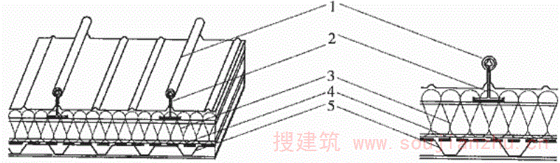 1-铝合金面板;2-支托;3-绝热保温层;4-隔气层;5-压型钢板