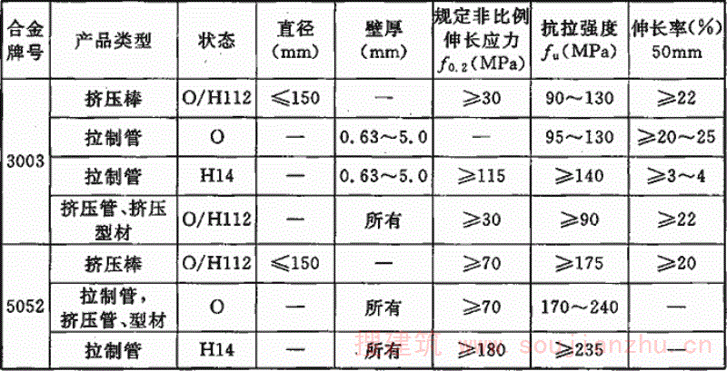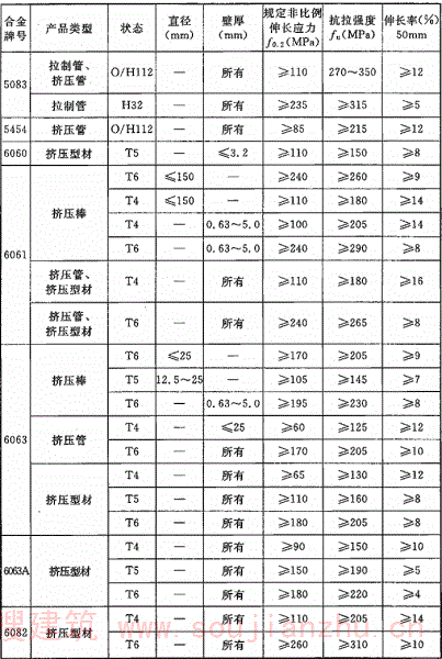表A-2 结构用铝合金管材、型材力学性能标准值