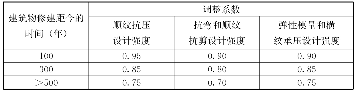 F.0.2 当古建筑原构件木材按现行国家标准 《木结构设计标准》GB 50005的规定确定其设计指标时,应乘修正系数,修正系数应符合下列规定: