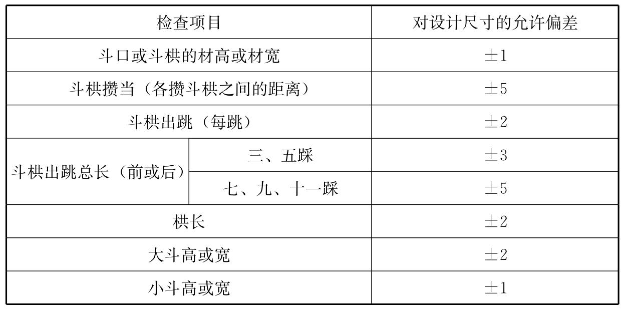 F.0.7 古建筑中斗栱的各部件尺寸,应按各时期的建筑法式确定,可不作结构验算。当维修中发现大斗原件被压扁,则应验算新斗的横纹承压强度。横纹承压设计强度,应按全表面横纹承压采用。当横纹承压强度不能满足计算要求时,宜改用硬质木材制作。