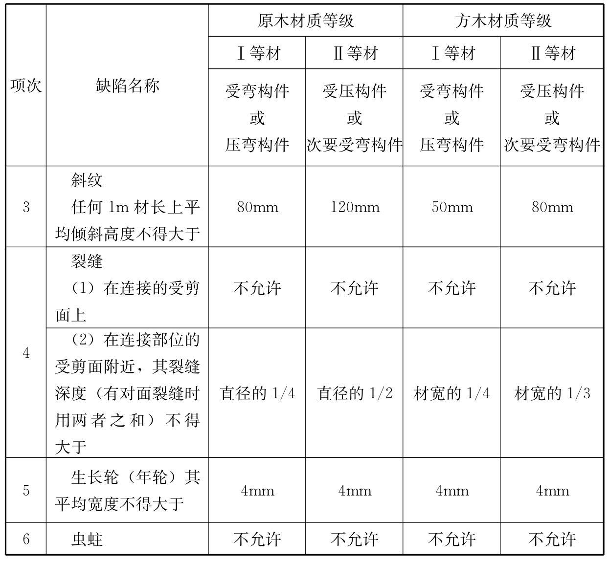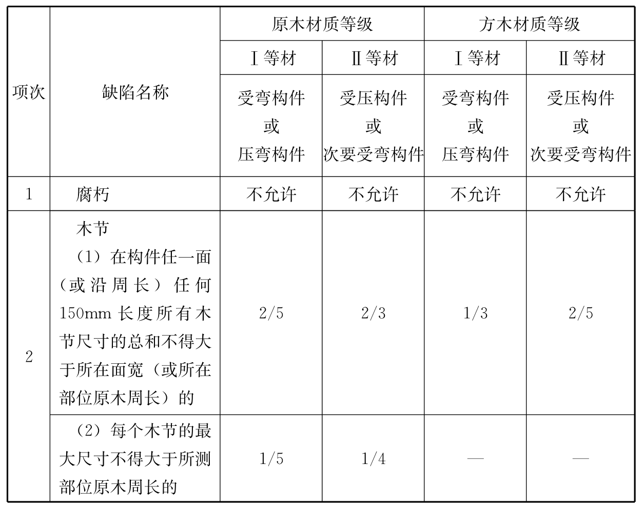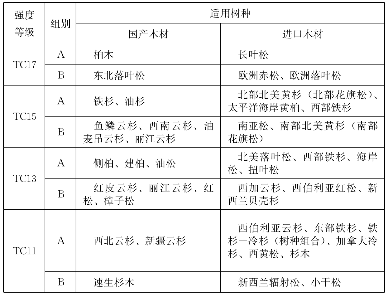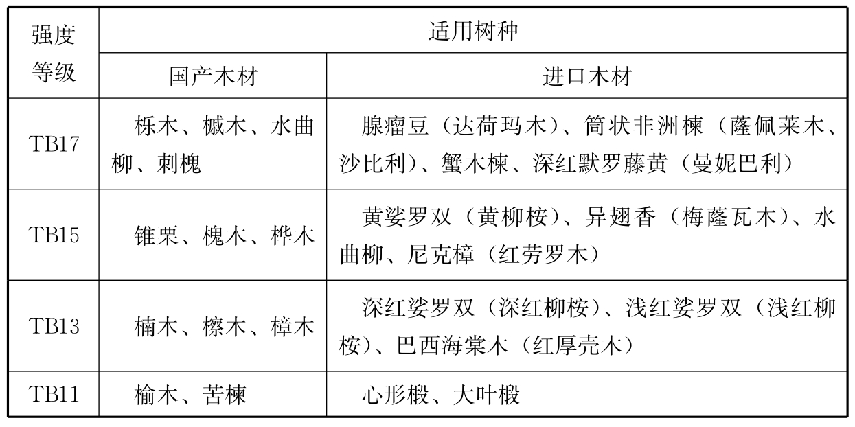 F.0.1 当安全性鉴定要求验算古建筑木构件承载能力时,应在工程勘查过程中,查明其树种及木材的外观质量,并应按下列规定推定其强度等级和设计指标: