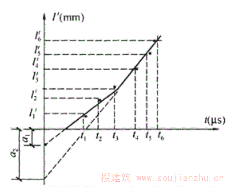4 用各测点的声时值t i 和对应的距离l i 绘制“时-距”图(图F.3.2-2)。分别用图中转折点前、后数据求出损伤和未损伤混凝土的“l-t”回归直线方程: