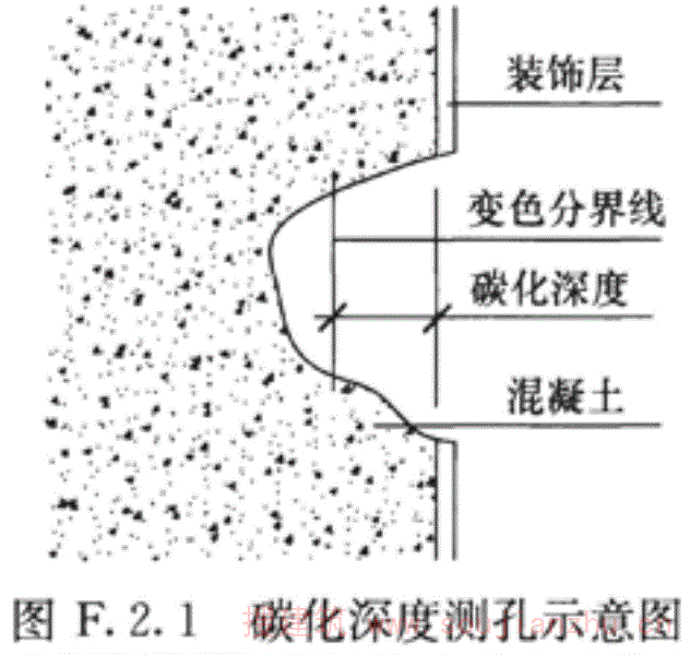 F.1.2 混凝土性能受影响层厚度应根据受影响层混凝土物理性质或化学性质的可能变化选择碳化深度测试方法或超声法进行检测。