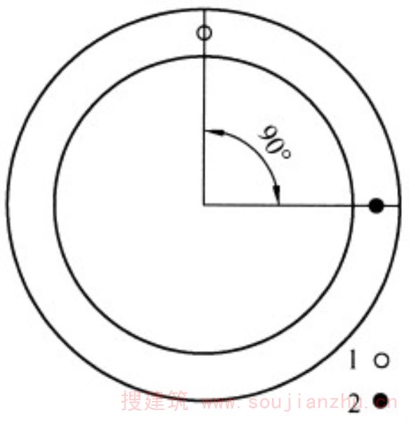 5.2.2低应变反射波法主要是用来检测现浇混凝土大直径管桩的桩身完整性和成桩混凝土的质量。现浇混凝土大直径管桩桩型不同于实心桩,低应变检测时桩顶附近一定深度范围内存在三维效应和高频干扰问题。研究表明,当传感器接收点与激振点之间所夹圆心角为90°时,接收信号受到的高频干扰最小,因此低应变动力检测时现浇混凝土大直径管桩桩顶激振点和测点的布置(图3),应将传感器安装在与激振点夹角90°的位置,且在桩壁中心线上,检测时在桩顶应均匀对称布置4点(应根据工程情况选择合适的锤头或锤垫,在保证缺陷分辨率的情况下尽量采用较宽的激励脉冲可以减小高频干扰,击发方式可采用力棒、力锤等方式。现场测试结果表明基于合适的击发和接收装置,采用低应变动测技术测试现浇混凝土大直径管桩的施工质量是可行的,检测结果能较好地反映现浇混凝土大直径管桩的施工质量。