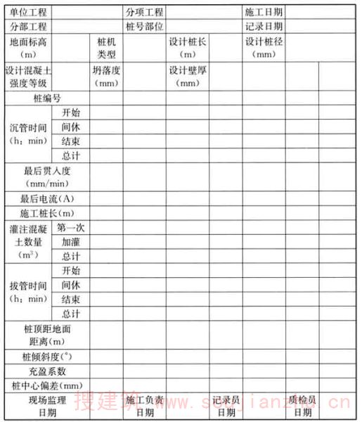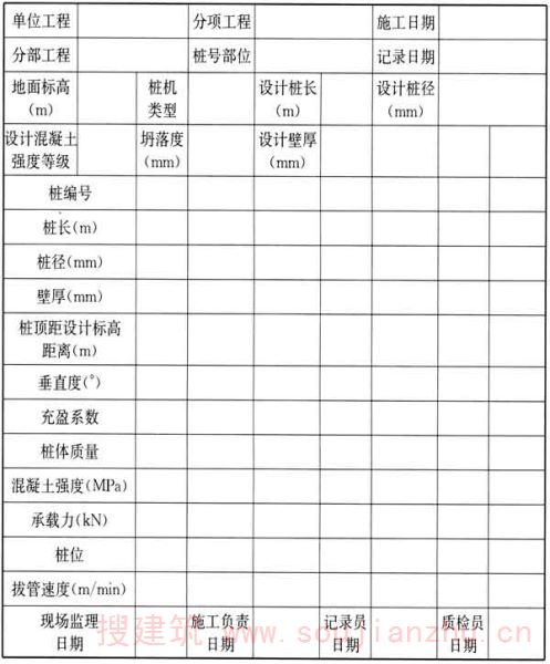 5.1.1 现浇混凝土大直径管桩成桩质量检查应包括成孔、混凝土拌制及灌注等过程的检查,并应按下列规定填写质量检查记录:
