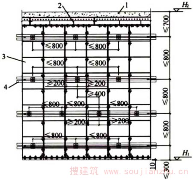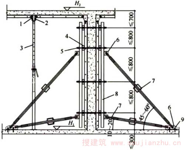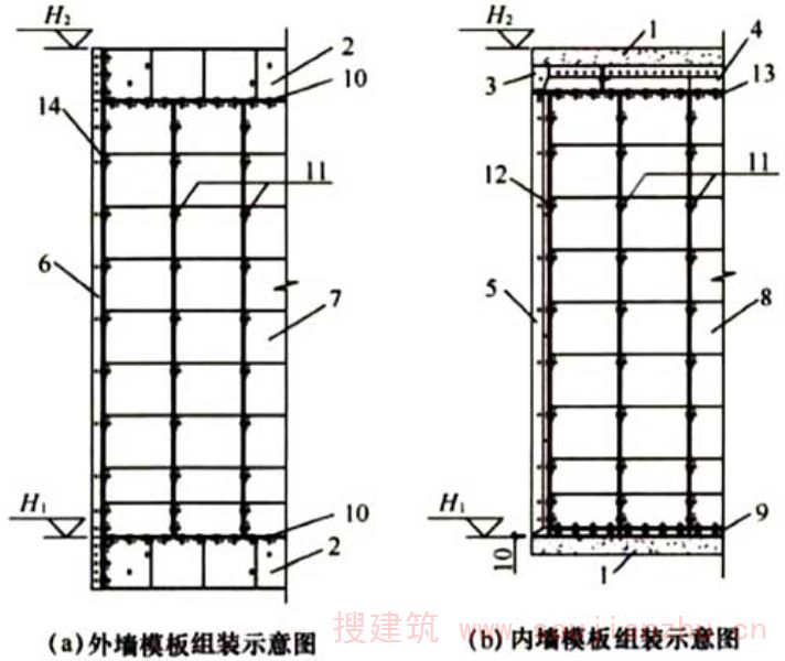 2.1.10墙、柱、梁、楼板等构件的模板按照规定的施工顺序组拼起来,形成整体,再进行整层混凝土浇筑。在混凝土浇筑过程中,模板整体承受混凝土的自重与侧压力、施工荷载、风荷载等。